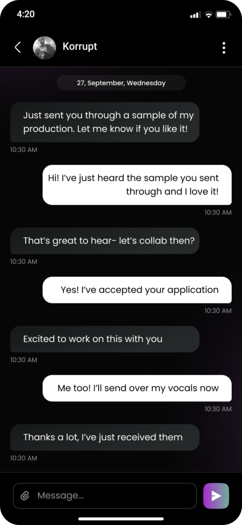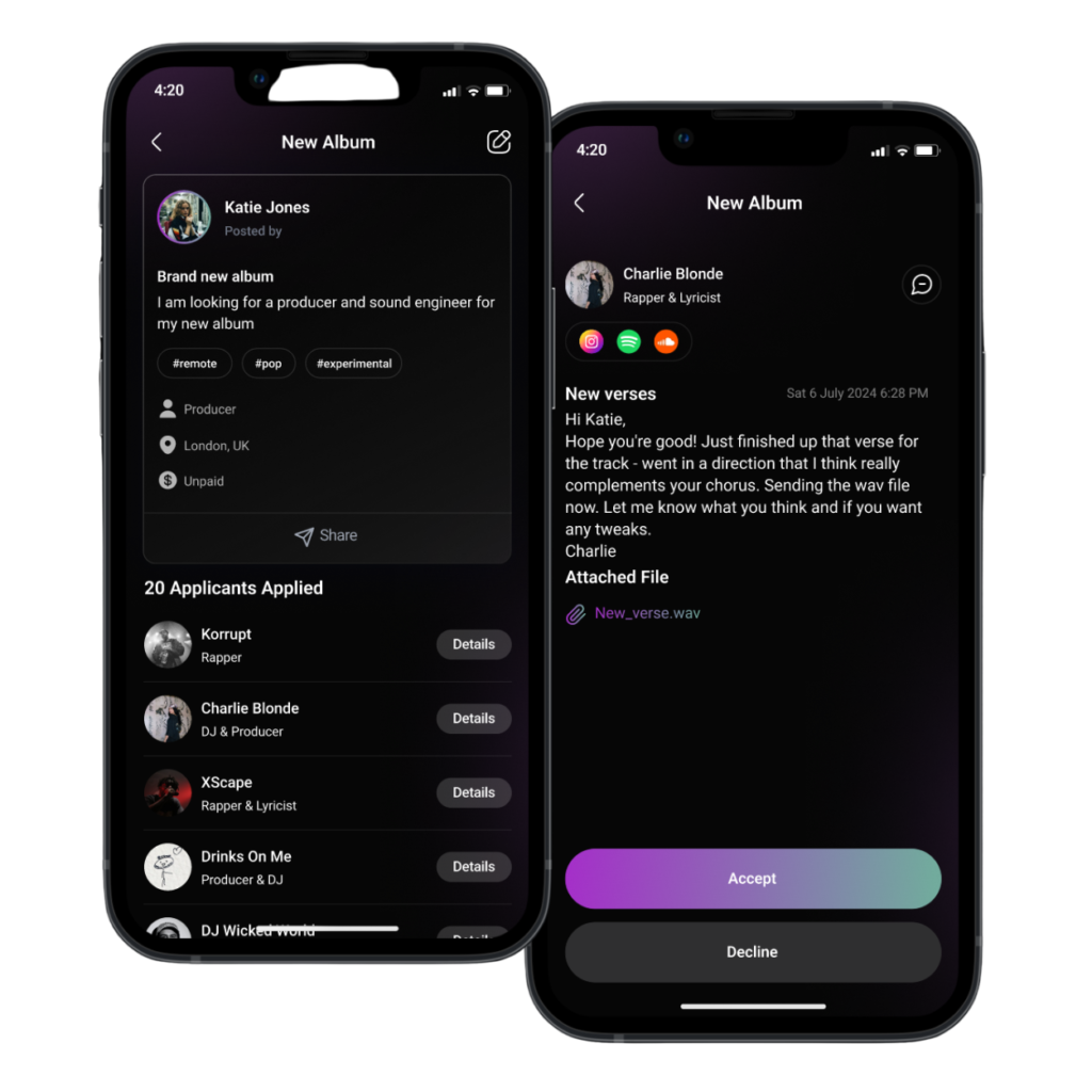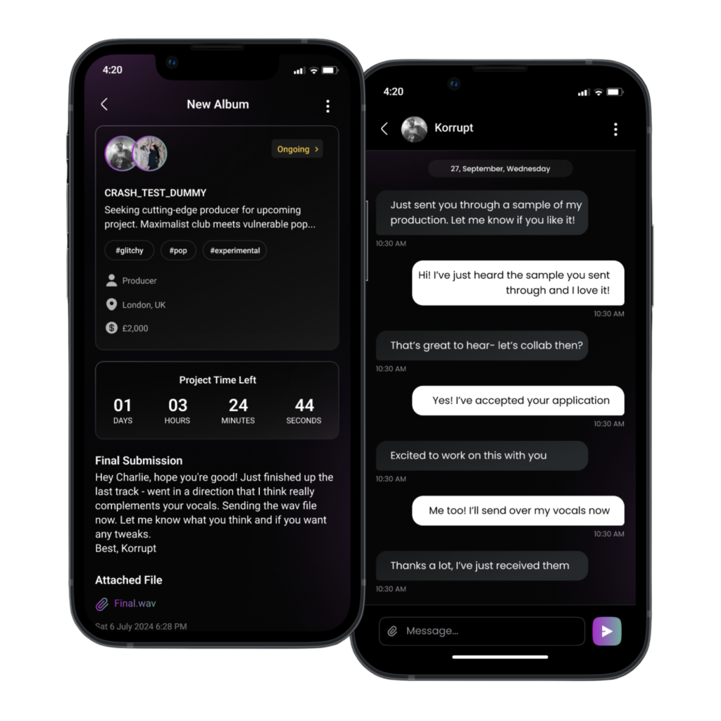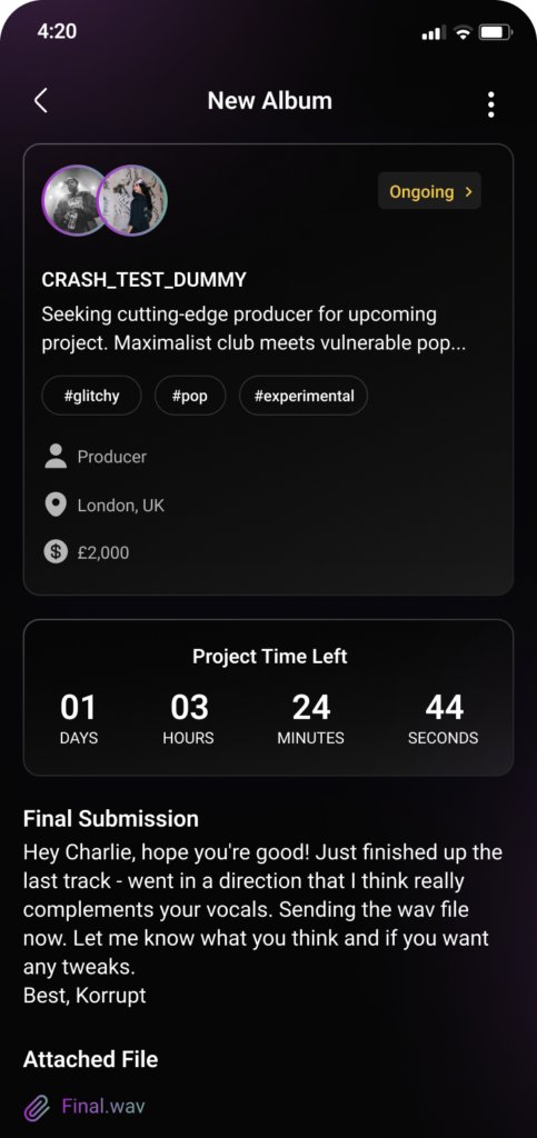 Once you’re accepted for a project, you’ll gain access to a dedicated workspace where you can share files securely, communicate directly with your collaborators, track project progress, and manage deliverables. Everything is kept organised in one secure space.