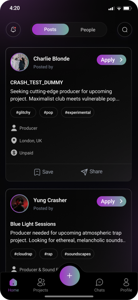 You’ll find a diverse range of creative projects including music production, film scoring, content creation, visual design, video production, podcast creation, and cross-media collaborations. Projects range from quick turnaround work to long-term creative partnerships.